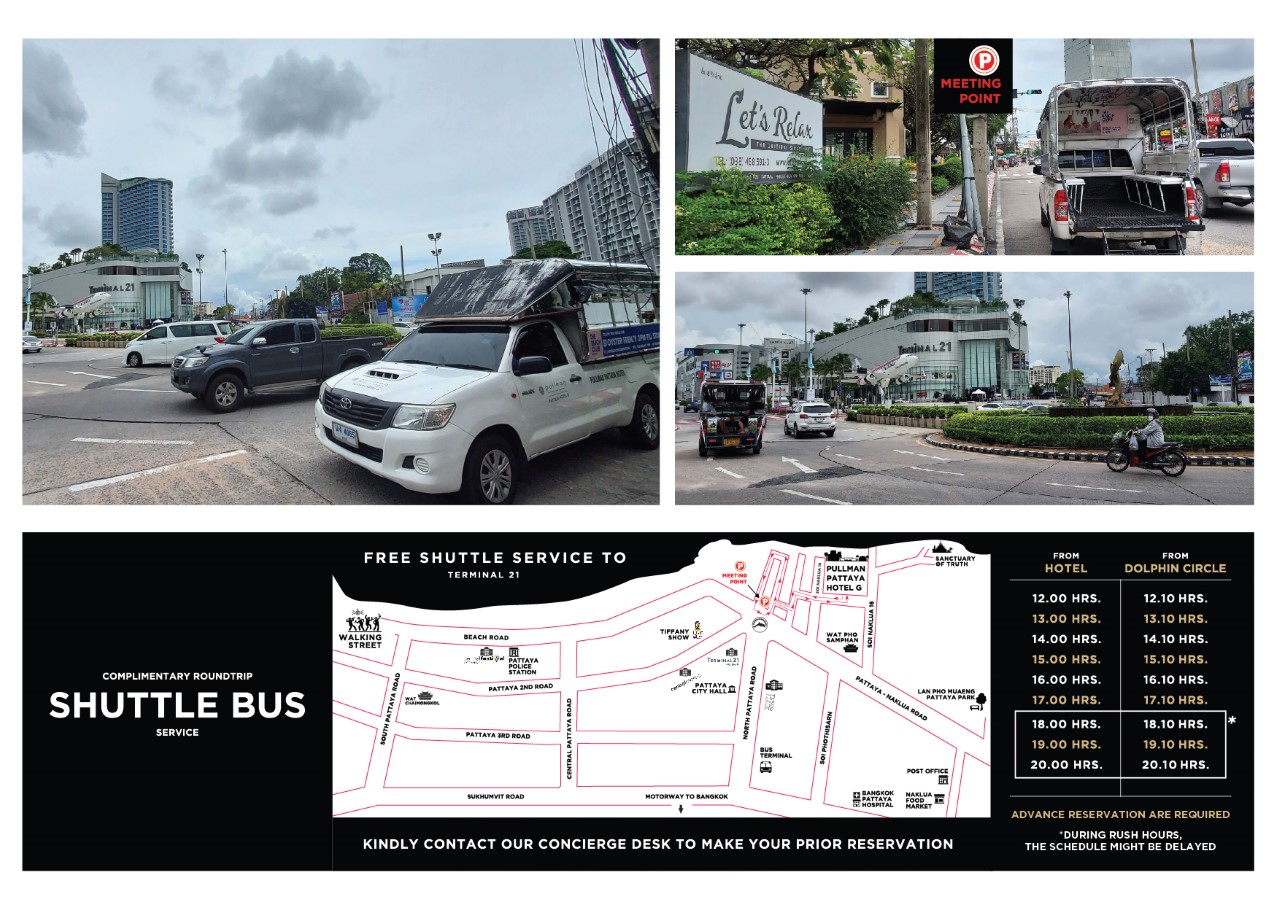 호텔에는 셔틀버스가 있어요. 파타야의 상징인 돌고래상에 하차하고, 터미널 21 쇼핑몰에서 탑승하면 됩니다.